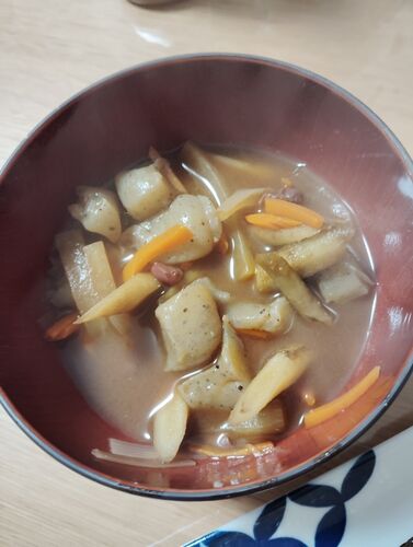 事八日だった昨日、お事汁を作りました。 『お事汁』 昔から無病息災を願って事八日に食べられる。 六質汁ともいう。 さといも、大根、にんじん、ごぼう、あずき、こんにゃくの6種の具材で作るお味噌汁。 毎回作るたびに『八日』の8が強烈過ぎて、さといも…